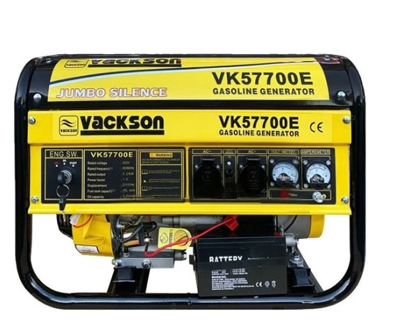 این ژنراتور برق تحتعنوان مدل «VACKSON VK57700E» عرضه شده است. این موتور برق انرژی موردنیاز خود را از طریق احتراق بنزین تامین میکند. مخزن سوخت بنزین این محصول حجمی برابر با 15 لیتر دارد. موتوری که از این سوخت انرژی الکتریکی تولید میکند، از نوع چهارزمانه است و قدرتی معادل 7 اسب بخار دارد. ظرفیت این موتور 210 سیسی است. این موتور تکسیلندری به کمک جریان هوا خنک میشود و صدای 68 دسیبلی تولید میکند. با کمک این محصول میتوانید برق AC و DC موردنیاز دستگاههای برقی خود را تامین کنید. سیم پیچی موتور برقهای واکسون 100% از مس میباشد . توان این ژنراتور 3200 وات است و از طریق دو پریز درپوشدار برق AC را در اختیار کاربر قرار میدهد. این برق ولتاژی برابر با 220 ولت دارد. همچنین برق DC خروجی نیز با ولتاژی برابر 12 ولت از شدتجریانی 8.3 آمپری برخوردار است. این محصول وزن مناسبی دارد که به راحتی قابل جا به جای است.